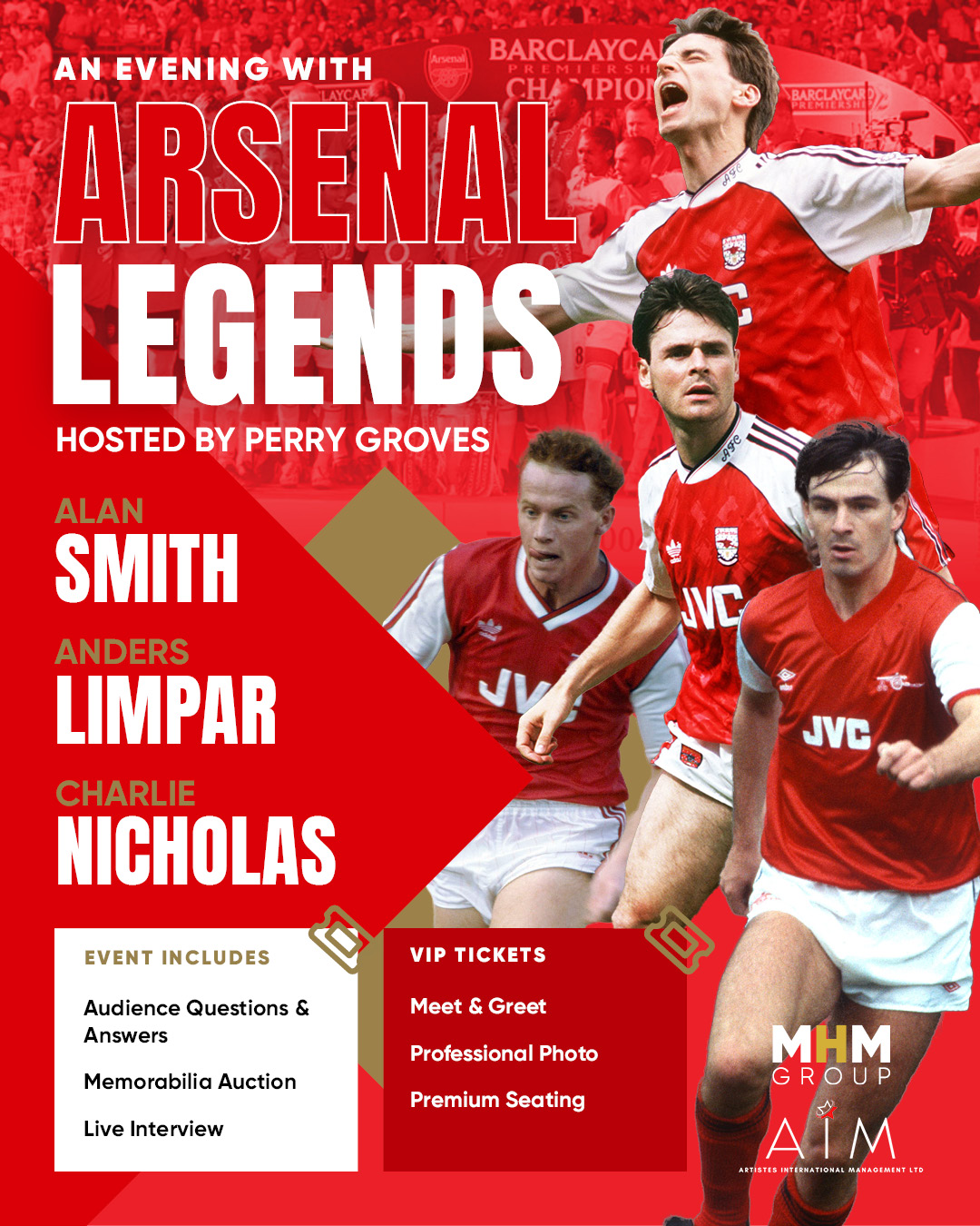 Amassing more than 500 appearances in the red and white of The Gunners between them, three Arsenal legends are coming to town to talk about their action-packed football careers. Starring Alan Smith, now a regular face on Sky Sports and commentator, along with Charlie Nicholas (TV Pundit) and Anders Limpar. Hosted by Perry Groves (another Arsenal Legend and Talksport presenter) as they discuss the games, dressing room/training ground stories, managers, fall outs and everything you wanted to know about playing for a successful football club.