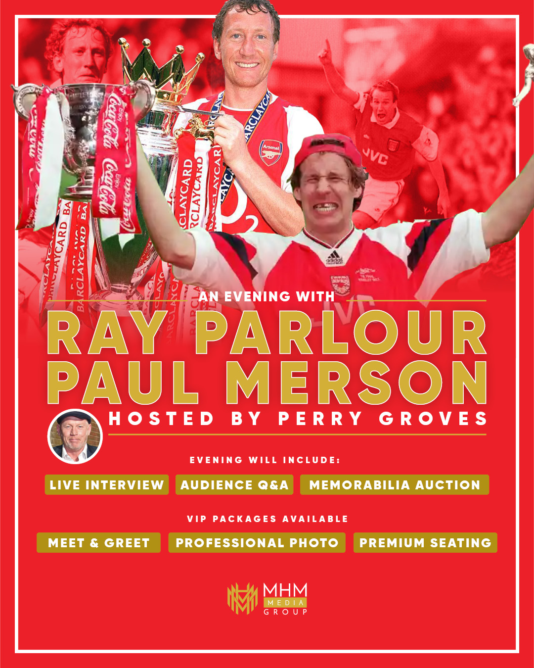 Starring Ray Parlour (Romford Pele) Paul Merson – now a regular face on Sky Sports; midfielder Perry Groves – now a radio presenter will discuss the games, dressing room/training ground stories, managers, fall outs and everything you wanted to know about playing for a successful football club.