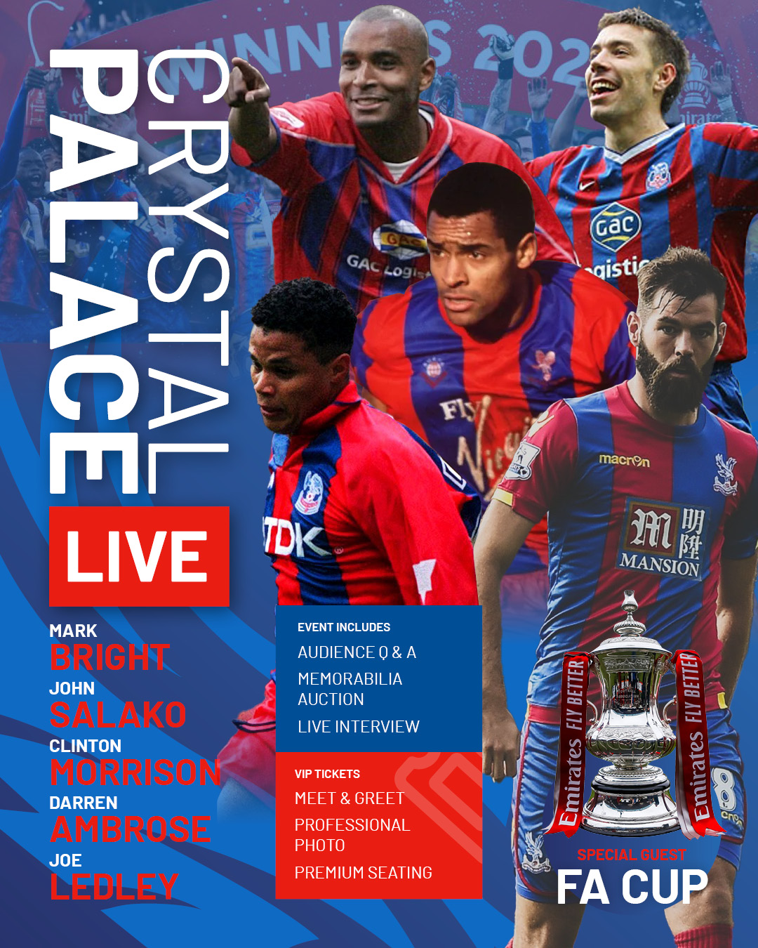 tep into Selhurst Park history as five iconic Crystal Palace heroes — Mark Bright, John Salako, Clinton Morrison, Darren Ambrose, and Joe Ledley—come together for an unforgettable evening of football nostalgia, banter, and behind-the-scenes stories.