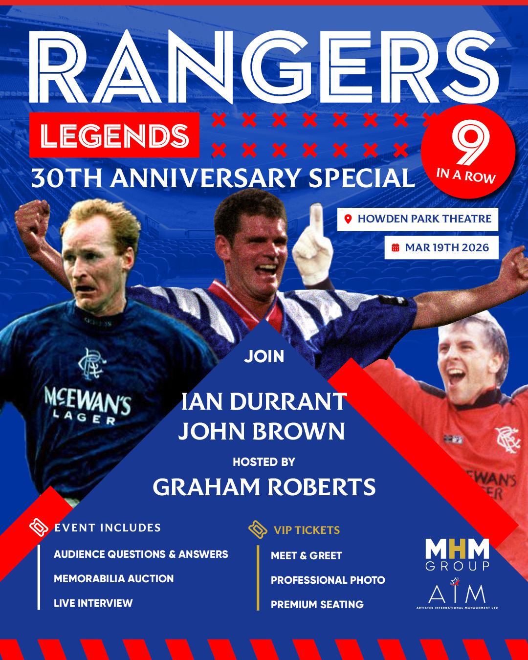 Join three Ibrox icons for an unforgettable evening of football stories, club pride, and behind-the-scenes revelations. Featuring John Brown, Ian Durrant, and Graham Roberts, this is your chance to hear first-hand accounts from the players who lived and breathed Rangers through some of its most defining eras.