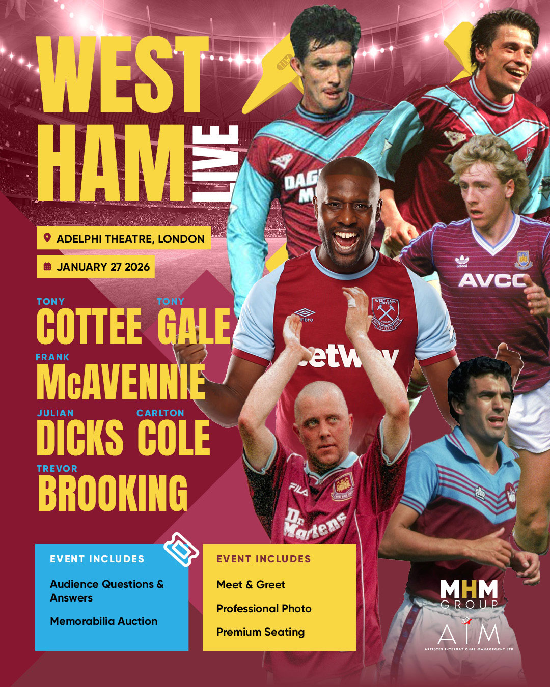 Join Tony Gale, Frank McAvennie, Carlton Cole, Julien Dicks, Tony Cottee, and Sir Trevor Brooking for a night of football stories, insights, and nostalgia.